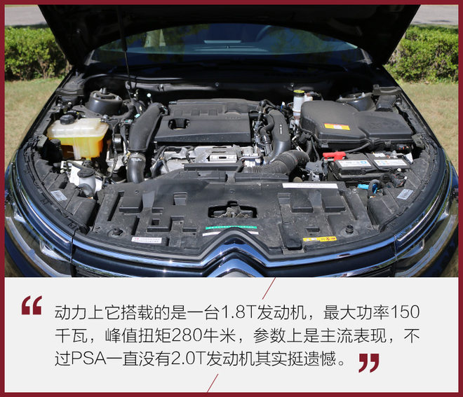 本次测试的主角是C5 380 THP豪华型,全系的最高配,无论是动力还是配置层面都能最直观体现C5的水准。380 THP车型搭载的是一台1.8T发动机,传动系统匹配的是6速手自一体变速箱,与同级竞争对手相比动力组合并不落人后。在PSA集团旗下车型上,1.8T+6AT的组合让人很熟悉。