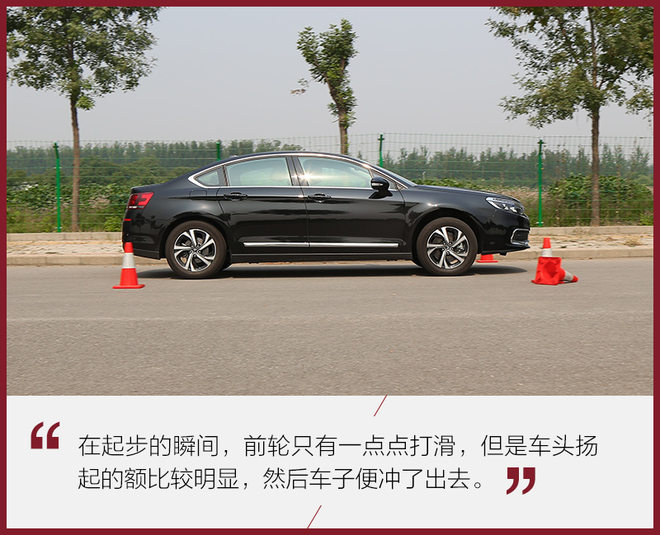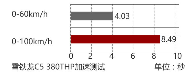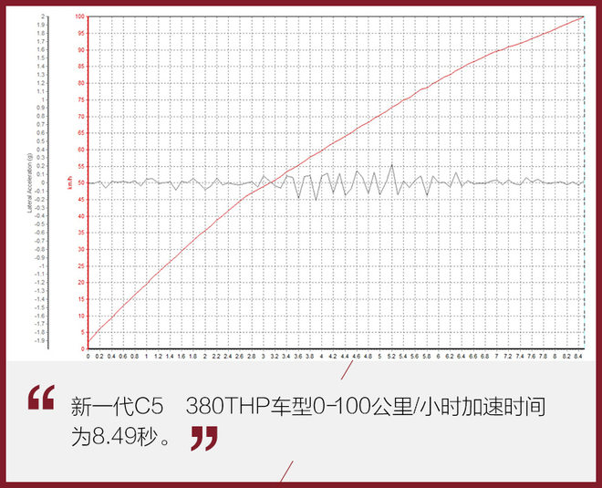 在0-100公里/小时加速测试当中,C5加速初段出现打滑的现象,但并不明显。在经过多次测试后,C5的0-100公里/小时加速成绩锁定在了8.49秒,其他成绩也大致在8秒左右,表现十分稳定。