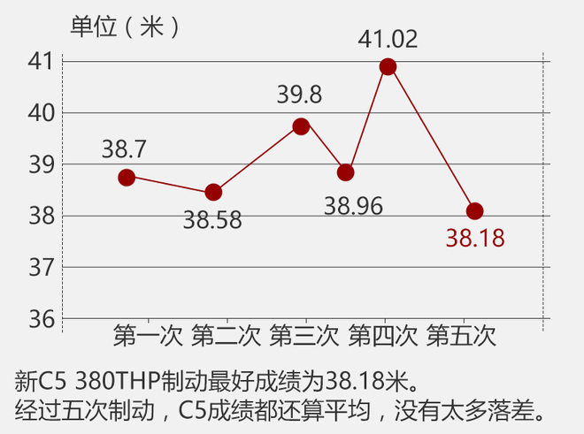 在100-0公里/小时制动测试当中,经过几次尝试,C5的最好成绩为38.18米,这已经属于同级别车型的佼佼者。其余制动距离也几乎都在39米上下浮动,热衰减现象并不明显。在紧急刹车的时候,C5的尾部已经有明显的翘起,但整体姿势保持的还可以接受。