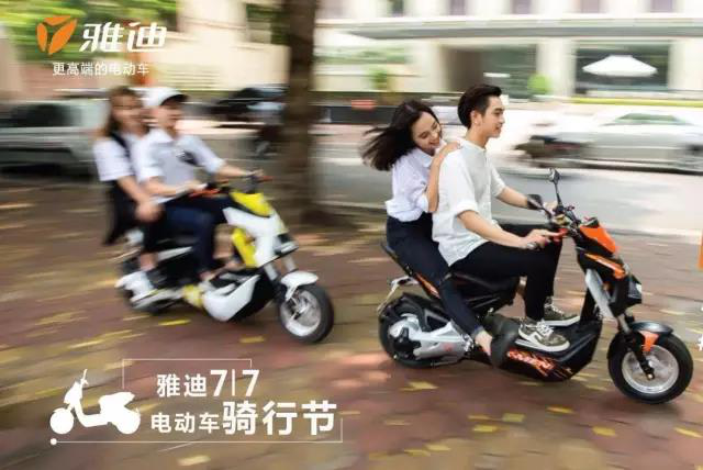 雅迪在高端市场的带动和引导下,选择电动车早已不是原来的价值标准:便宜、耐用、服务好。取而代之是,选择外观更时尚、品牌知名度更高、品质和服务更有保障的、骑出去更有面子的“大品牌”。一句话就是:选择雅迪,选择更高端的电动车。