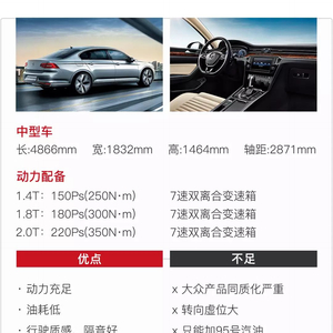 教授点评:和老兄弟帕萨特相比,迈腾更早进行了换代,用上了新平台。EA888+7速DSG的黄金动力匹配依然引领行业水平,把动力和油耗兼顾得很好。重点是经过多年改良,大众的双离合变速箱已经摆脱了故障多和顿挫大的黑点。非要挑毛病的话,就是大众的车无论是几万还是几十万,内外设计的区别都不大,最多就体现在用料和配置上,这或许会让一些花了20万买迈腾的人心有不甘。