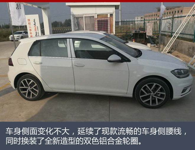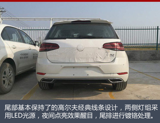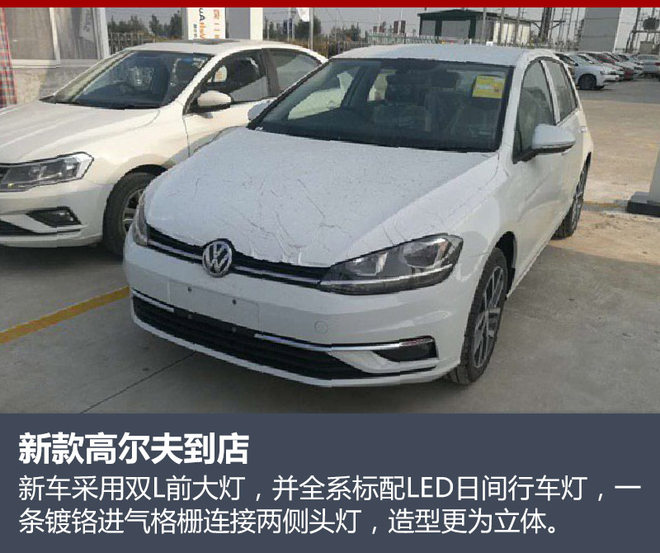 新款高尔夫设计风格与海外版车型相似,在外观细节上同样进行升级,前脸造型更为犀利、车身线条更加流畅。新车前脸部分采用单横幅镀铬格栅,下方饰条延伸至大灯两侧,全新双L造型的前大灯将全系标配LED日间行车灯。下侧进气格栅和雾灯部分进行重新调整后,进一步拉伸横向视觉宽度。