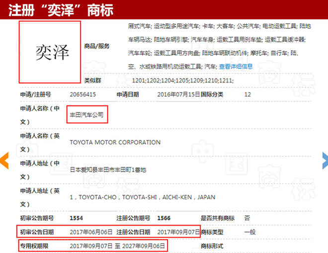 根据商标局的公示信息,丰田于2016年7月15日正式提交了“奕泽”这一商标的注册申请,专用权期限为10年,自2017年9月7日至2027年9月6日。根据一汽丰田的产品命名方式,全新商标有望被用于国产版C-HR车型,这款新车也是一汽丰田首款基于全新TNGA架构打造的产品。