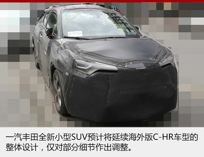 一汽丰田全新小型SUV预计将延续海外版C-HR车型的整体设计,仅对部分细节作出调整。海外版C-HR采用悬浮式车顶设计,逐渐向下的侧窗线条呈溜背式风格,搭配造型犀利的LED前大灯、光带式日间行车灯和回旋镖式LED尾灯,整体造型极具辨识度。同时,新车的前、后保险杠和侧裙底部采用黑色元素装饰,尾部配备大尺寸扰流板,跨界风格十分明显。