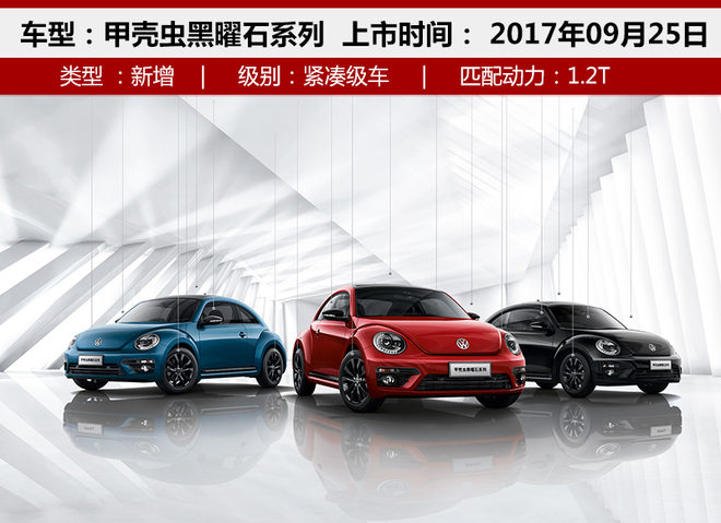 大众甲壳虫黑曜石系列车型拥有的魅惑红、织锦蓝、水墨黑三种配色,并且配上双氙气大灯和LED日间行车灯,使得新车整体活力感十足。新车多处使用黑色涂装,其中包括五辐轮圈、后视镜、车顶涂装以及黑色保险杠装饰条等等。