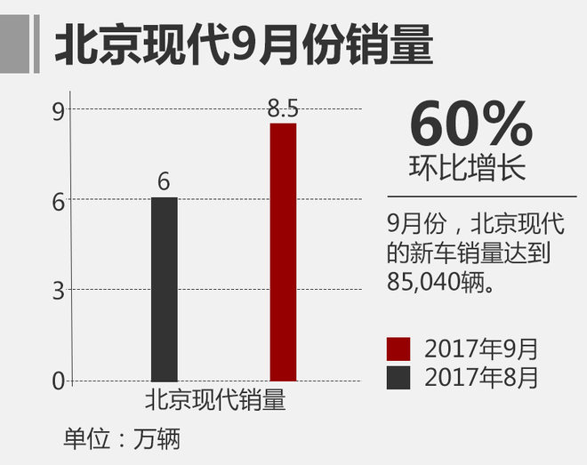 从2002年成立之初到今年整整15年的发展,北京现代正式迎来第900万辆产品下线,接下来将继续推进本土化战略全面迈向2.0阶段,从产品、服务、品牌等多个维度打造未来的核心竞争力。近日,网通社从北京现代官方了解到,在刚刚过去的9月份共销售新车85,040辆,相比8月份环比增长60%。这也是北京现代今年中国市场遇冷后,连续4个月实现正增长。