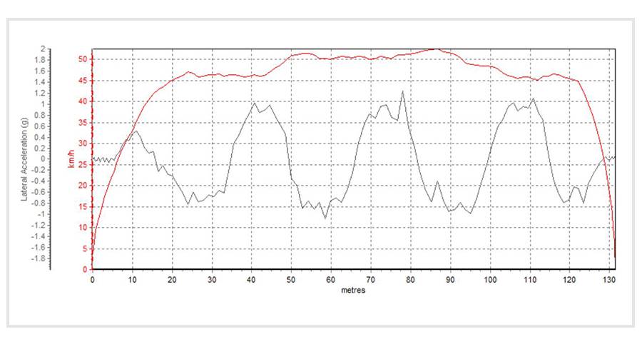 调节到动态模式,这时候方向盘手感并没有变得很重,转向力度依然较轻,它并没有让驾驶员感到强烈的紧迫感;悬挂自然会“绷得更紧”以此减少车身多余晃动,尽可能地提供车身支撑力。最终,沃尔沃V90 CC的桩间最大速度能达到52.23km/h,表现只能算中规中矩。不过细细一想,它的重心高度没比SUV低多少,4939mm的车身长度也算得上是“庞然大物”,这个绕桩成绩并不意外。