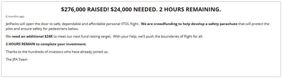 此前,JetPack曾在官网上发出投资邀请,希望能众筹一百万美元用于产品研发。但现在看来,他们距离这个数字还是有不小的距离: