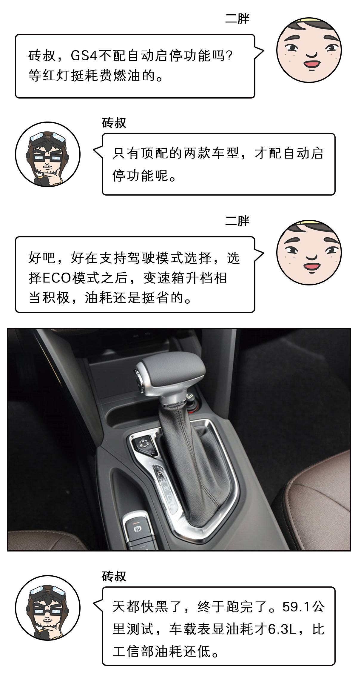 传祺GS4的车重不到1.5吨,相比同级车型轻了150公斤左右,这对降低油耗有很大帮助,特别是在走走停停的路况下。