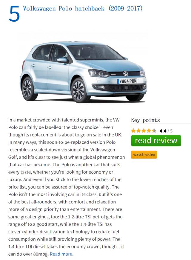 Polo和之前高尔夫的情况差不多,吸引英国人的法宝还是动力和舒适性,1.2TST、1.4TSI、1.4DTI强劲又省油,底盘舒适性好开起来轻松,而英媒上Polo特点加了一个卖点,看上去更豪华(luxury),原来英国人也觉得大众比较高级。