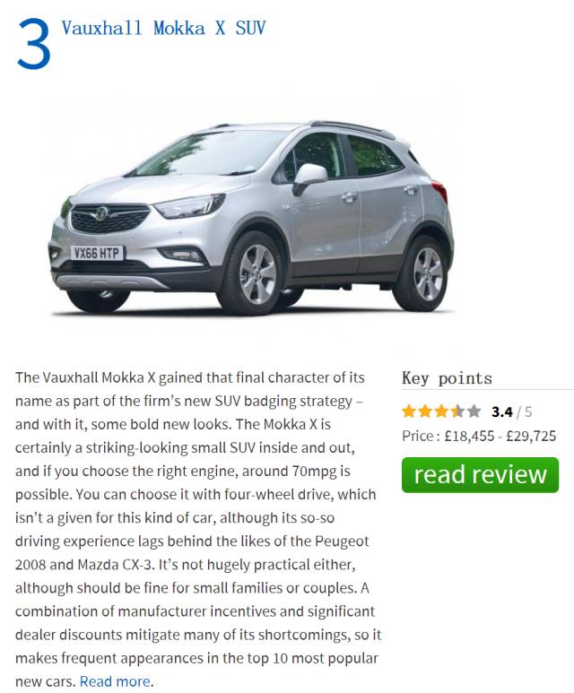 这车名字好像很陌生,但车型我们一点不陌生,就是别克昂科拉,Vauxhall自称是英国本土品牌,其实已经被全面通用化了。英媒对它的评价是,选对了发动机油耗可以很低,有同级少有的四驱系统,尽管操控不如2008和CX-3,但经销商的优惠够大,让它经常出现在销量榜的前十。