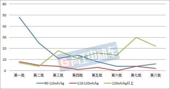 综合来看,在1-8批推荐目录中,系统能量密度超过120wh/kg以上的纯电动乘用车车型占比大幅提升。与往年的统计可以看出,系统能量密度指标明显提高,相信这距离工信部、发改委、科技部于2017年4月印发的《汽车产业中长期发展规划》提出的“到2020年,新能源汽车动力系统比能量力争达到260Wh/kg;到2025年,动力电池系统比能量达到350Wh/kg”发展目标虽不中亦不远矣。(图片来源于高工电动车)