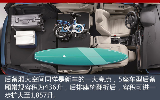 此外,新车第二排还配备了Easy entry便利进入功能,可实现一键向前翻折并滑动第二排座椅,使进出第三排更为便捷。部分7座车型除主驾驶席外,所有座椅均可独立翻折并形成一个完整的平面;6座版车型带来的2+2+2座椅布局,座椅位置还可前/后调节。;5座车型后备厢常规容积为436升,而在后排座椅翻折后,可进一步扩大至1,857升。