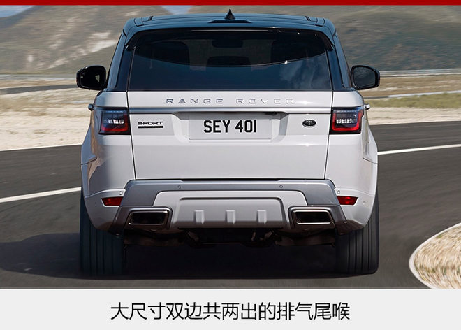 新款路虎揽胜运动版PHEV车侧线条较为平顺,采用悬浮式车顶造型,车圈提供三种颜色漆面。新车尾部的转向灯位置与新款揽胜运动版车型保持一致,并且采用四边形的双边共两出的排位尾喉,使得新车尾部运动感十足。