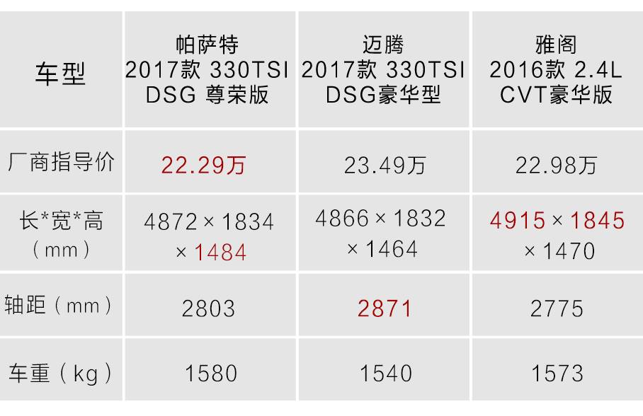 选取的三款车官方指导价都接近23万元,这样可以更直观地对比它们之间的区别。作为中级车,车身尺寸和空间自然是看重的环节了。具体数据上,雅阁的车身长度和宽度小占优势;而迈腾借着2871mm的轴距表现出色胜出。雅阁的轴距虽然比不上两位对手,但得益于本田空间最大化的“MM理念”,乘坐空间也不会处于下风。