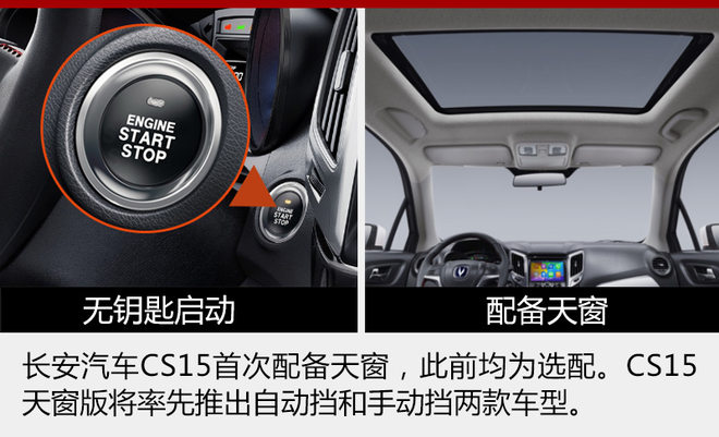 CS15天窗版预计依然延用长安家族式的设计,中控台呈现V字视觉特色,配有7英寸触控显示屏。新车最大亮点在于首次配备天窗,而此前车型均为选配。此外新车还配备发动机自动启停、无钥匙启动、以及定速巡航等配置。C新车将搭载in Call智能车载互联系统。这一系统配备高德导航、生活服务、WIFI通道、一键救援等功能,并支持百度Carlife互联系统。