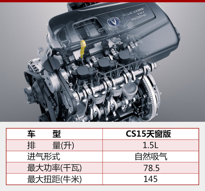 CS15天窗版搭载BlueCore 1.5升全铝合金发动机,属长安EA高效能发动机系列,应用DOHC顶置双凸轮轴和DVVT(双可变气门正时)技术,强调动力与能耗的平衡性,最大功率可达78.5千瓦,峰值扭矩145牛米,匹配五速手动和五速DCT双离合变速箱。(图/文 网通社 徐晓晨)