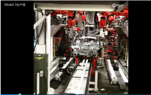 公开视频显示,许多库卡机器人正在Model 3车身的焊接台上紧张工作。