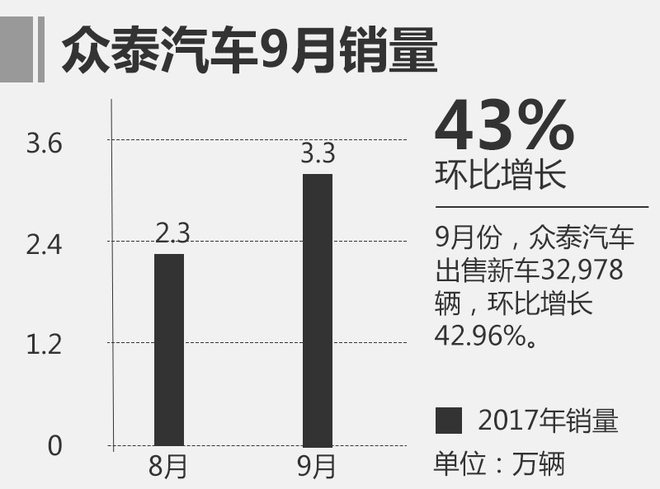 众泰汽车目前拥有SUV、轿车、纯电动车三大版块,2017年9月总销量为32,978辆,环比增长42.96%。其中,轿车版块9月出售3,411辆新车,环比增长25.91%;SUV版块单月出售新车27,063辆,环比增长41.9%。