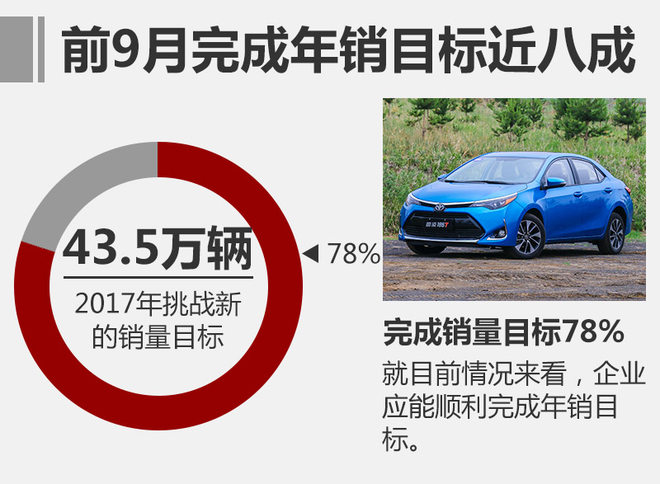 自2017年1月份以来,广汽丰田的整体销量一直呈现出平稳的增长趋势。9月份,企业共售出新车40,985辆,同比增长2.6%。就前9个月的整体销售情况而言,广汽丰田累计销量已达到339,014辆,与去年同期相比,销量增长了8.22%。今年年初,广汽丰田定下43.5万辆的全年销售目标,前9个月已完成近八成销量目标,就目前情况来看,企业应能顺利完成年销目标。