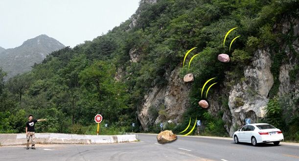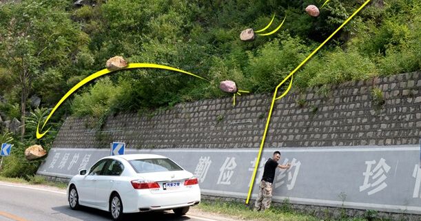 如果事情出现在没有经过加固的原生态山体,就是说没有太大角度的变化,一旦发生落石情况,石头会顺着山体滑下来这时我们应当尽量跑到远处躲避落石。因为石头会顺着山体向下冲,方向不会改变太多,落地后会继续向前滚动,所以距离山体越远相对越安全。
