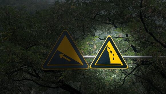 这个标志相信大家在驾照考试的时候都很熟悉,但是实际驾车时很多时候会不记得。如下图所示这就是落石标示,相信不少朋友都见过它,示意的还是比较形象的,如果广大的驾驶员朋友没有特别关注这个标志现在就再加强一次记忆吧。它一般出现在山区,所以可能与左侧的“前方上坡”或者其他山路标志同时出现。所以在看到这些标志时就要留心山体落石。
