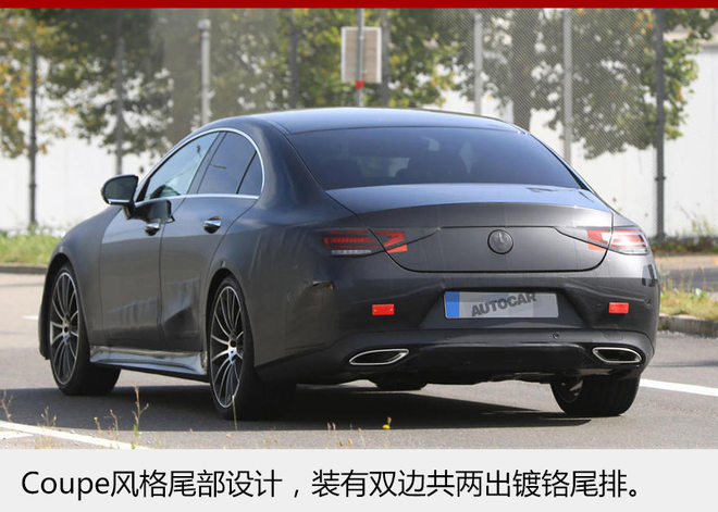 车尾部分,后尾箱看起来更有奔驰Coupe系列车型的设计元素。LED光源尾灯采用分体造型,底部配有的双边共两出排气尾喉更显得激进。