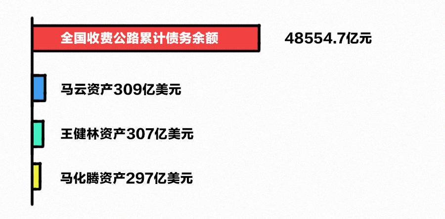 过路费不仅仅是用来还贷款,养路费用、养人的费用都包含其中。交通部的数据显示,截至2016年底,全国收费公路累计债务余额为48554.7亿元。这笔钱是多少呢?即使马云马化腾王健林的全部家当来填坑,加起来也不足8000亿元,还有40000亿元没着落。