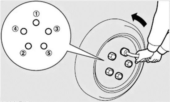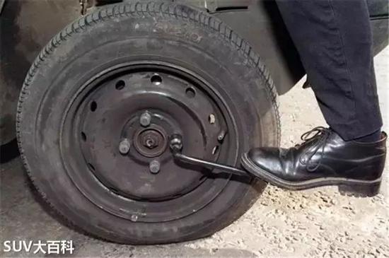 拿到扳手之后你先得把轮子上的固定螺栓松开,把套筒扳手套在螺栓上,逆时针转,转不动的时候可以拿脚踩,只要螺栓松动了就行了,这时候不要把螺栓拧下来。注意,螺栓要以对角线的顺序松,待会儿上螺栓的时候也是。