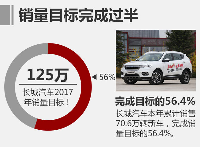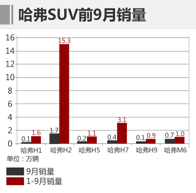 哈弗品牌SUV贡献了76.2%的销量,具体到各车型,哈弗H2单月销售1.7万辆新车,同比下降18.3%。但这款车本年累计销量达15.3万辆,同比增长33.9%。而新推出的哈弗M6上市第二月的销量已攀升至0.7万辆,两月时间不到累计销量已接近1万辆。