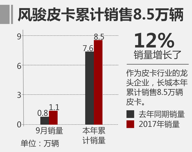 随着购车因素的多元化以及皮卡解禁的政策利好,皮卡行业的龙头老大长城旗下风骏系列的销量持续增长。其9月销量为1.1万辆,同比增长38.8%;而本年累计销售8.5万辆,相较去年同期同比增长11.7%。