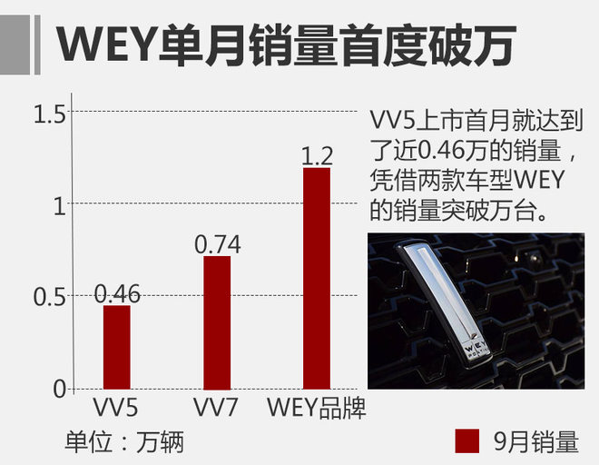 随着中产阶级群体的扩大,消费升级逐渐成为厂商关注的方向,长城也顺应趋势推出了豪华品牌WEY。而自首款车型VV7上市以来,可以说销量逐渐攀升。网通社从长城汽车官方获得了其9月份的销量数据,其哈弗品牌SUV销量为7.7万辆;WEY品牌凭借VV5和VV7两款车,销量首度突破万台,达到1.2万辆。长城汽车9月整体销量则为10.2万辆,本年累计销售70.6万辆。
