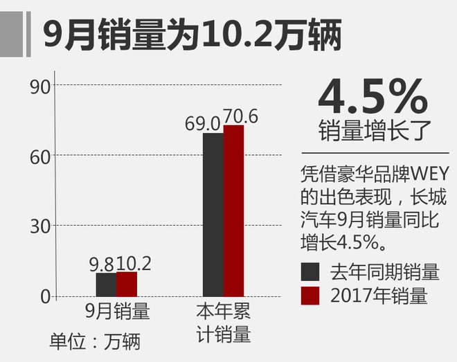 长城汽车公布的9月份的销量数据显示,其中风骏皮卡销售1.1万辆,哈弗品牌SUV销量为7.7万辆,WEY品牌凭借VV5和VV7两款车,销量首度突破万台,达到1.2万辆。9月份的整体销量则为10.2万辆,同比增长4.5%,本年累计销售70.6万辆,同比微增2.25%。