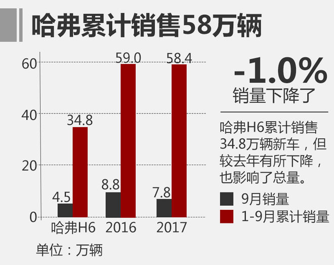 哈弗H2和H6两款车的销量占了哈弗品牌销量的85.9%,可以说两者承载了这一品牌的绝对销量压力。而哈弗H6在9月销量为4.5万辆,同比下降15.2%;本年累计销售34.8万辆,同比下降6.71%。H6的表现不佳造成了哈弗整体销量下滑1.04%,累计销量为58.4万辆。
