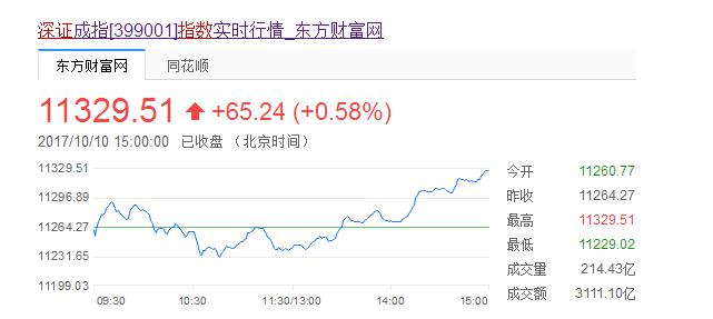 10月10日深证收盘指数为:11329.51