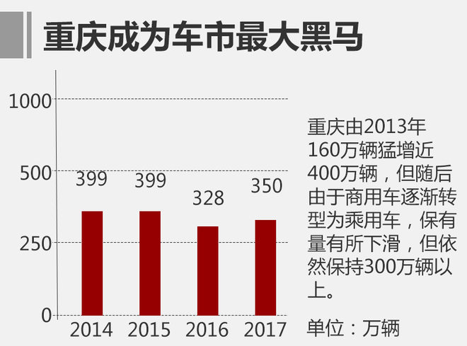 第三名属于绝对的“黑马”,重庆。2013年,重庆市汽车保有量为160万辆,排名全国第9,但仅仅一年时间,重庆汽车销量实现翻倍,以399万辆的成绩荣登次席。