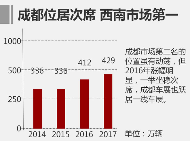 如果说北京的“夺冠”理所当然,但第二名的位置肯定出乎意料。这一城市并非是“北上广深”之一,而是归属于西南区市场。2013年,成都以240万辆的汽车保有量位居全国第二,但在随后的2年中先后被重庆、上海超越,直至2016年以412万辆的数据重回第二名。2017年,成都市场依然火爆,429万辆的数据与第三名差距较大。