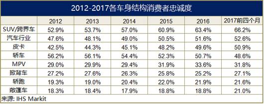 IHS Markit汽车忠诚度、行业分析主管Tom Libby这样解释:“车型特性方面,SUV/跨界车提供更多的尺寸、价格和功能(如越野车、都市SUV)选择。这些都刺激消费者对SUV/跨界车保持忠诚。于是出现同一细分市场内,一个品牌推出两三款车。”因而如今SUV的消费者忠诚度更高。
