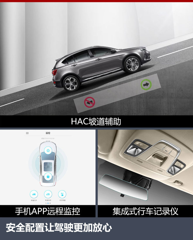 随着手机成为生活中不可或缺的一部分,吉利S1也贴心的配备了手机APP远程监控功能,通过手机APP可对车辆进行远程控制,实现查看车辆状态、远程锁车&关窗、远程启动发动机&空调、辅助寻车等功能,更加方便省心。值得一提的是,吉利S1还搭载了高清集成式行车记录仪,更好地保障车主权益并降低加装行车记录仪的成本。