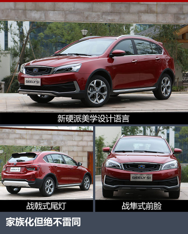 在前脸设计上,吉利S1上半部分采用了格栅与大灯相连的设计,造型灵感来自俯冲状态下的鹰隼,具有攻击性和爆发力。大灯设计灵感来自鹰眼,灯腔内的全LED灯组富有科技感。下格栅处采用了贯通式设计,源自攻击状态下猛虎的造型令前脸看起来更为凶悍。