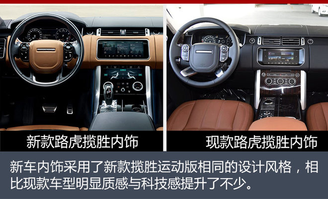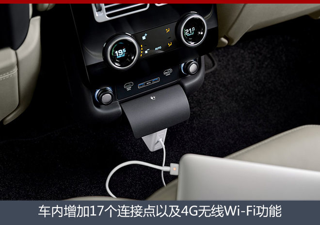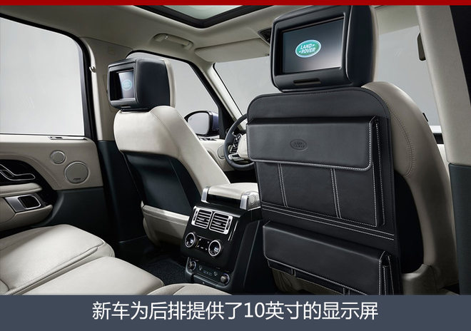 内饰方面,新款路虎揽胜的整体内饰采用了新款路虎揽胜运动版相同的设计风格,与现款相比,中控区大大减少了物理按键的出现,双触控屏幕的加入也使得新车的科技感与豪华感倍增。此外,新车还增加了17个连接点,包括12伏电源、USB接口、HDMI接口,同时新车配备的4G无线Wi-Fi功能可最多支持8台移动设备连接。