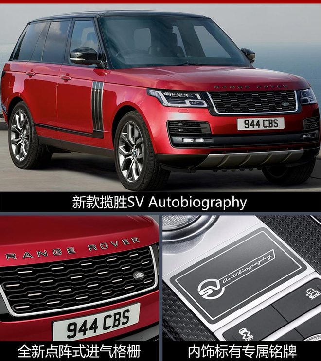 而新款揽胜SV Autobiography的造型也进行了升级,包括全新的点阵式进气格栅,熏黑的蜂窝格栅纹路令其更具攻击性。内饰部分,新款揽胜SV Autobiography在新款揽胜的基础上还提供碳纤维材质装饰可选,另外在换挡旋钮后方等位置还配备SV Autobiography标识,彰显其独特身份,同时该车还接受定制化服务。
