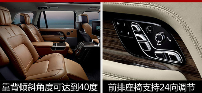 而在后排设计上,新款路虎揽胜高配版车型以及新款揽胜SV Autobiography版车型采用四座行政版座椅布局,前排座椅最多可支持24向调节,后排座椅除了配备腿托之外还支持最大40°的靠背倾角,为后排乘客提供不亚于前排的乘坐舒适体验,此外,新车还能通过手机APP来完成座椅调节等多项功能。