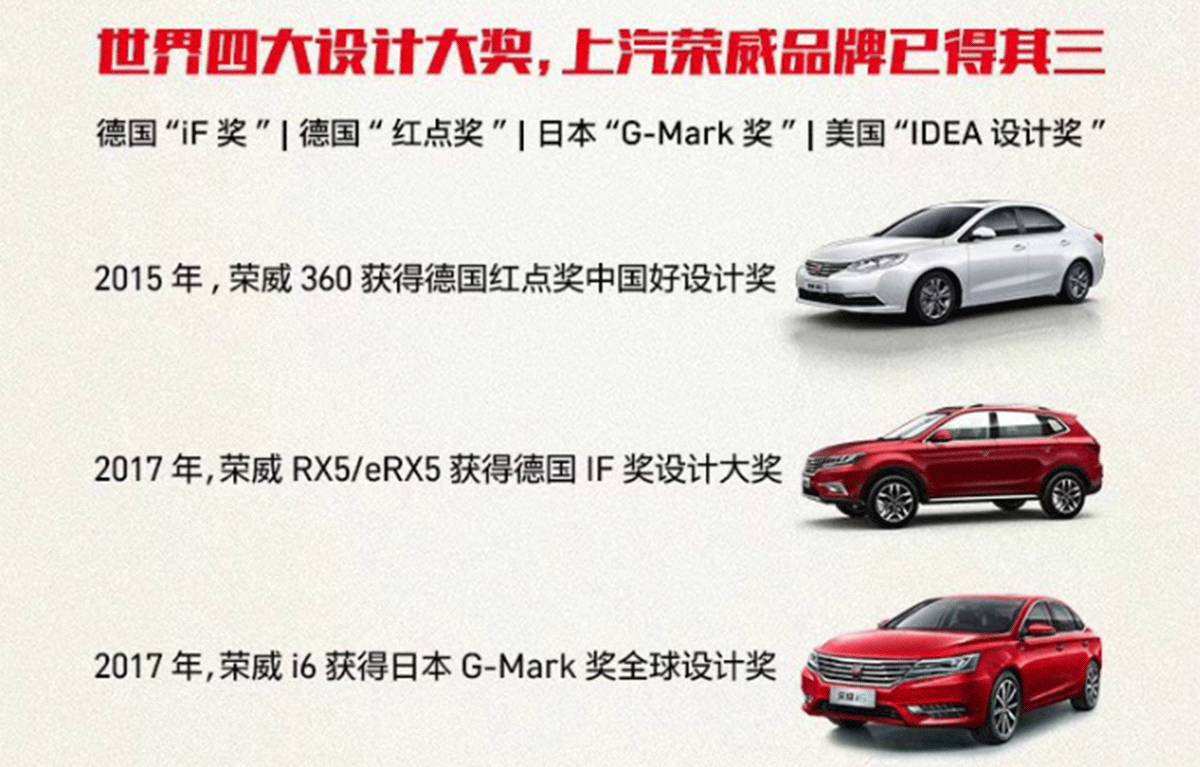而说到车辆设计,上汽荣威在这方面的功底一直属于顶尖行列。早在2015年,荣威360就获得德国红点奖中国好设计奖。而在今年,荣威RX5 (配置|询价)/eRX5又获得德国IF设计大奖。刚不久,荣威i6还获得了日本G-Mark奖全球设计奖,这是G-Mark奖60年来首次颁发给中国汽车品牌。