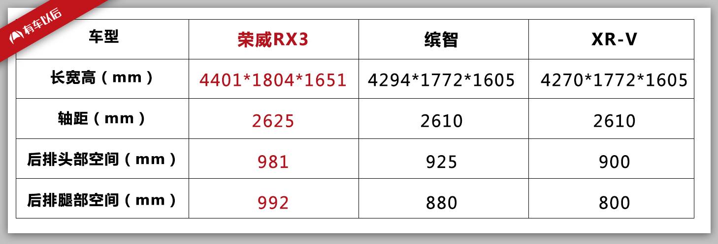 可以看出,荣威RX3在车身尺寸、轴距和车内空间方面都全面超越缤智和XR-V,显然车内乘坐舒适感会更加好。