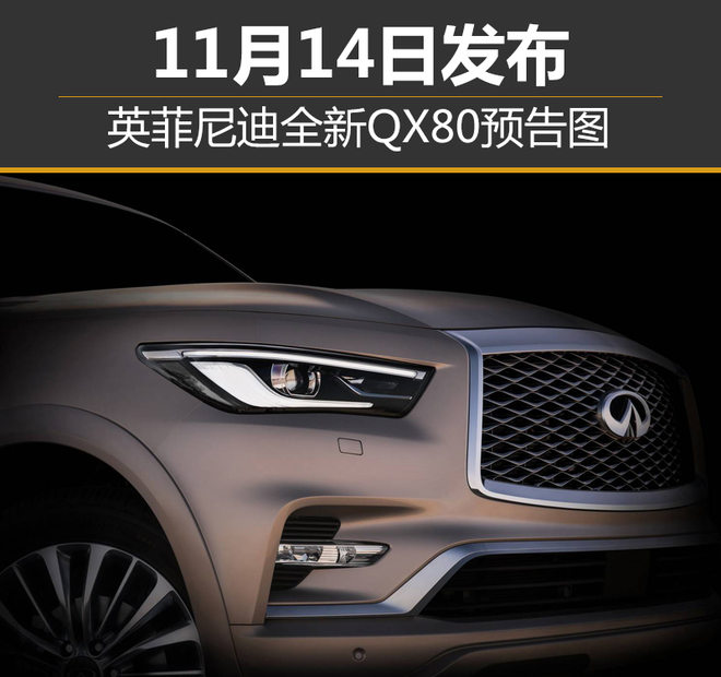 QX80 (配置|询价)是英菲尼迪旗下的一款全尺寸SUV,迄今已发布两代车型,目前以进口的形式在国内销售。网通社从美国媒体motor1获取了全新一代英菲尼迪QX80的预告图,新车将于11月14日在迪拜车展中全球首发。外观方面,全新QX80借鉴了QX80 Monograph概念车的设计灵感,整体造型时尚大气;动力方面,新车搭载5.6升V8发动机,随后还有望新增一款小排量发动机。