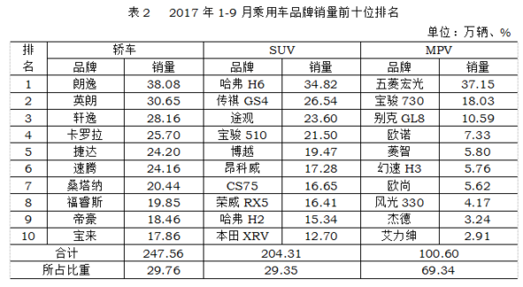 1-9月,乘用车产销分别完成1732.8万辆和1715万辆,比上年同期分别增长3%和2.4%,低于汽车总体1.7和2.1个百分点。乘用车四类车型产销情况看,比上年同期,除SUV产销继续保持增长外,轿车、MPV、交叉型乘用车产销继续呈现下降。其中轿车产销分别下降0.9%和1.5%,SUV产销分别增长16.4%和16.1%,MPV产销分别下降为15.4%和17.1%,交叉型乘用车产销分别下降27.4%和25.5%。