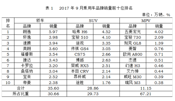 乘用车分车型生产企业销售情况:9月,销量排名前十位的轿车生产企业依次为:一汽大众、上汽大众、上汽通用、东风有限(本部)、长安福特、北京现代、吉利控股、一汽丰田、广汽本田和广汽丰田。与上月相比,上述十家企业销量均呈增长,其中北京现代和上汽大众增速更明显。9月,上述十家企业共销售84.93万辆,占轿车销售总量的73.14%。