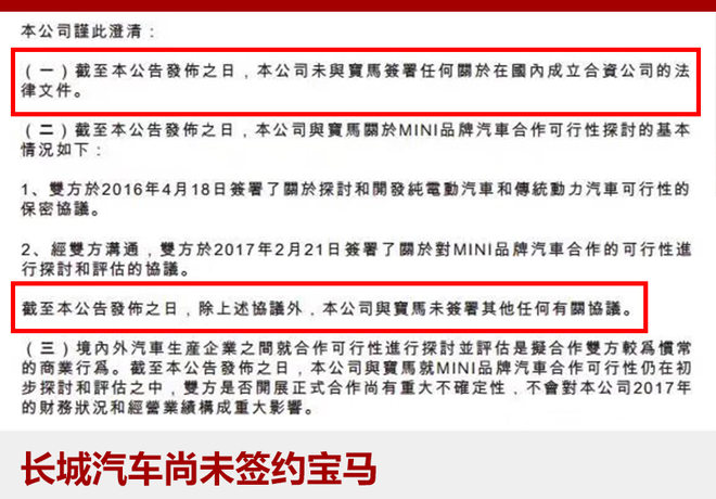 10月13日,长城汽车发布公告称尚未与宝马汽车签署任何关于在国内成立合资公司的法律文件。另据网通社了解,长城与宝马分别于2016年4月和2017年2月签署了相关保密协议,双方将对MINI品牌汽车合作的可行性进行探讨和评估,但是否开展正式合作尚有重大不确定性。