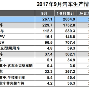 9月,汽车生产267.09万辆,环比增长27.64%,同比增长5.54%;销售270.91万辆,环比增长23.93%,同比增长5.66%。其中:乘用车生产229.72万辆,环比增长28.37%,同比增长2.94%;销售234.26万辆,环比增长24.92%,同比增长3.27%。商用车生产37.37万辆,环比增长23.33%,同比增长24.97%;销售36.66万辆,环比增长17.94%,同比增长23.94%。 1-9月,汽车产销2034.92万辆和2022.45万辆,同比增长4.77%和4.46%,增幅比1-8月提升0.10个百分点和0.21个百分点,比上年同期减缓8.48个百分点和8.71个百分点。其中乘用车产销1732.80万辆和1715.05万辆,同比增长3.03%和2.38%;商用车产销302.11万辆和307.40万辆,同比增长16%和17.85%。